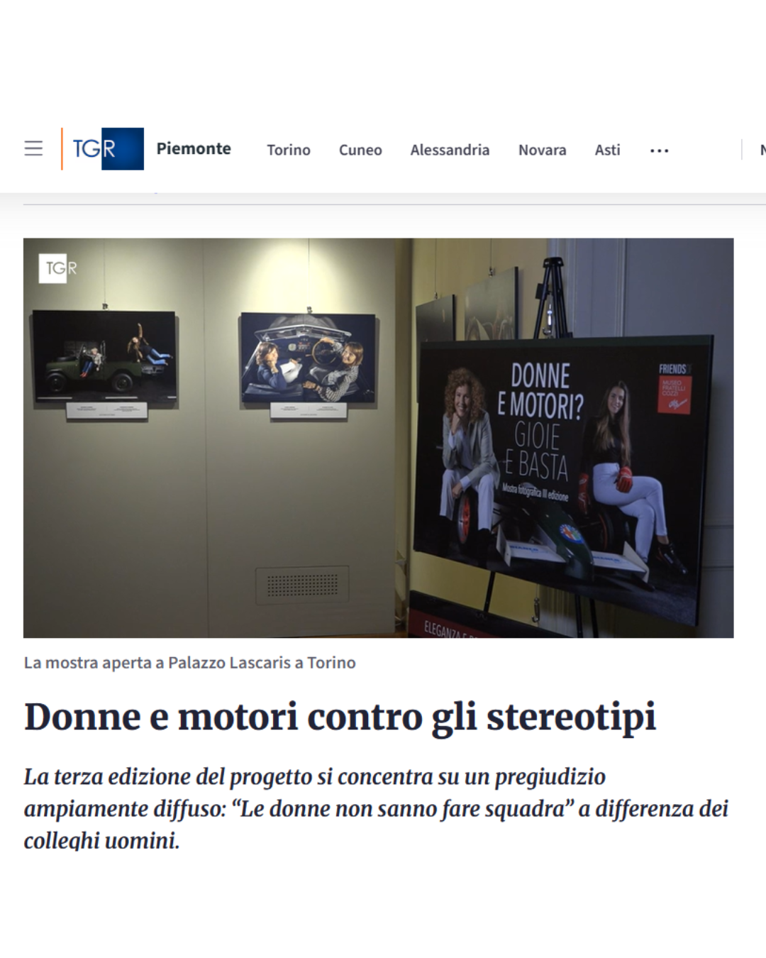 «Negli spazi della Galleria Carla Spagnuolo di Palazzo Lascaris, sede del Consiglio regionale del Piemonte, è ospitata la terza edizione della mostra fotografica “Donne e Motori? Gioie e Basta!”, ideata da Elisabetta Cozzi, fondatrice e presidente del Museo Fratelli Cozzi di Legnano (MI), promossa dall’associazione Friends of Museo Fratelli Cozzi».