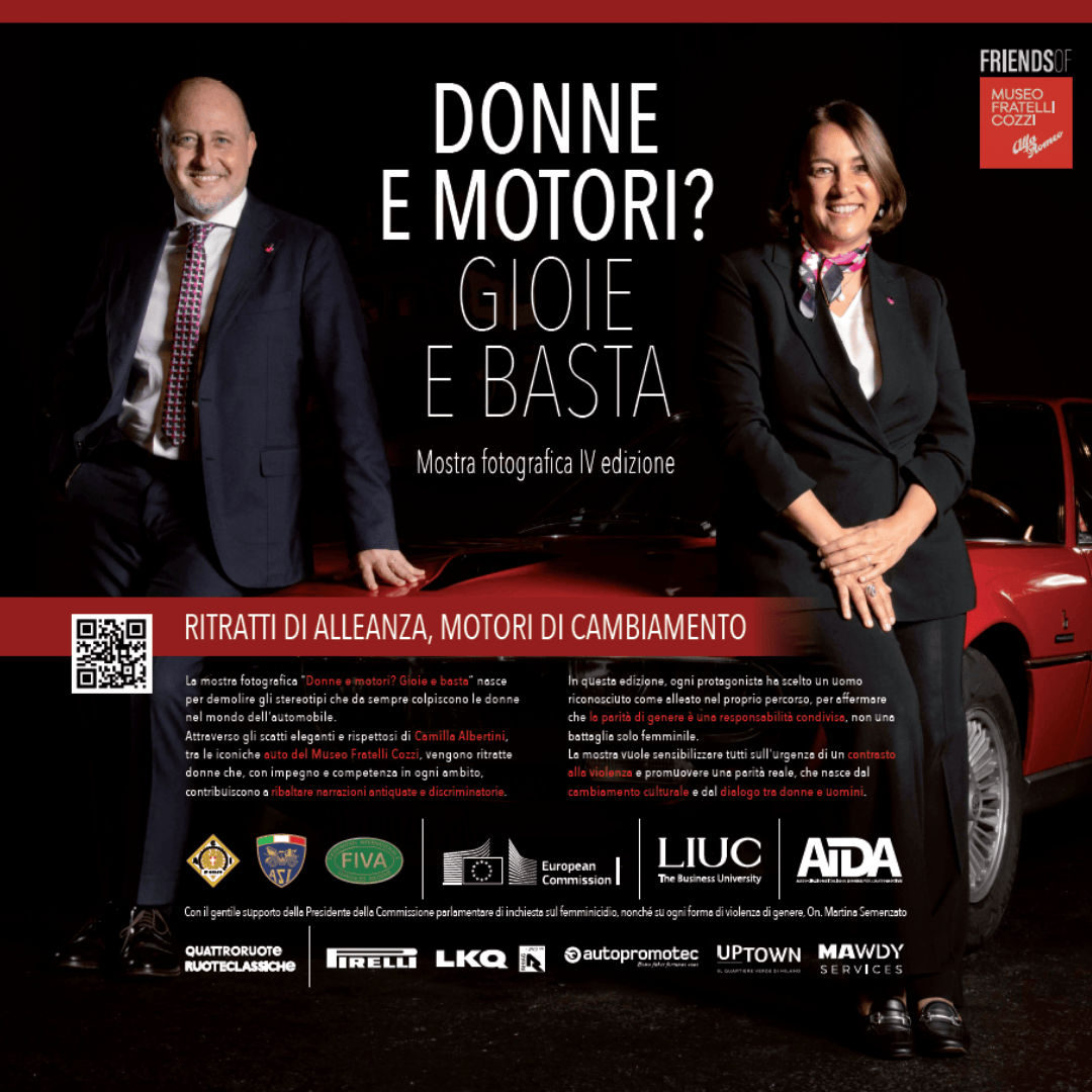 After the preview at Milano AutoClassica, Fiera Rho, on 21–22–23 November, the official presentation of the exhibition will take place on 25 November 2025 at 6:30 p.m. at Museo Fratelli Cozzi, on the occasion of the International Day for the Elimination of Violence against Women. The exhibition will be produced in three copies and will immediately begin its travelling journey.