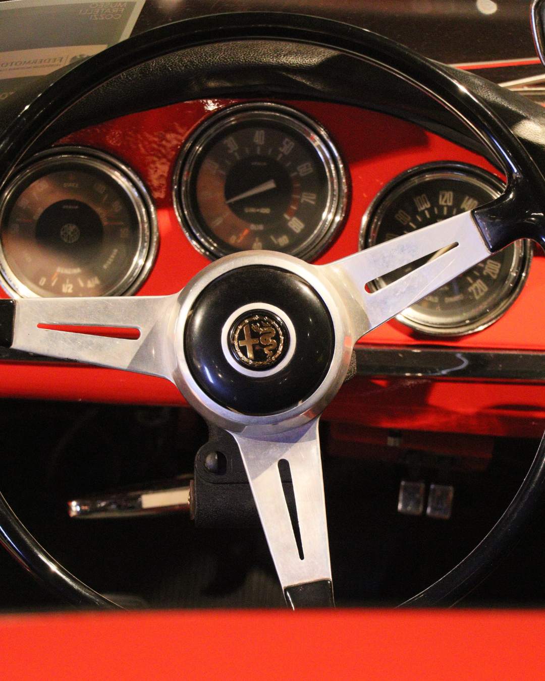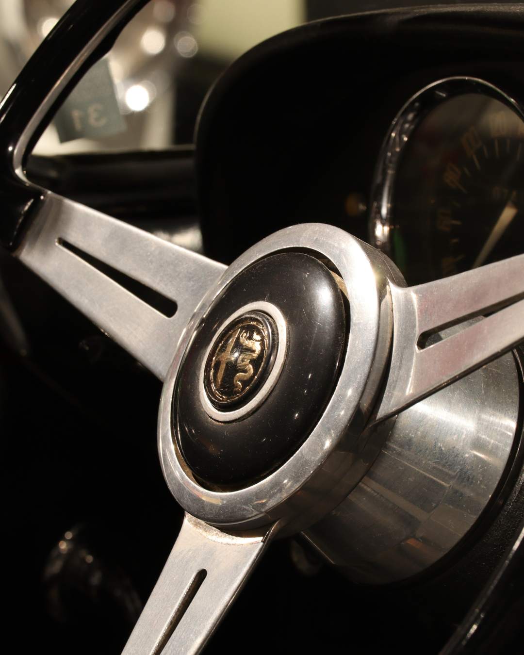 foto 1.13: il volante a tre razze, molto sportivo, della “Giulia T.I. Super” del Museo Cozzi, uno dei due esemplari realizzati in “grigio grafite”