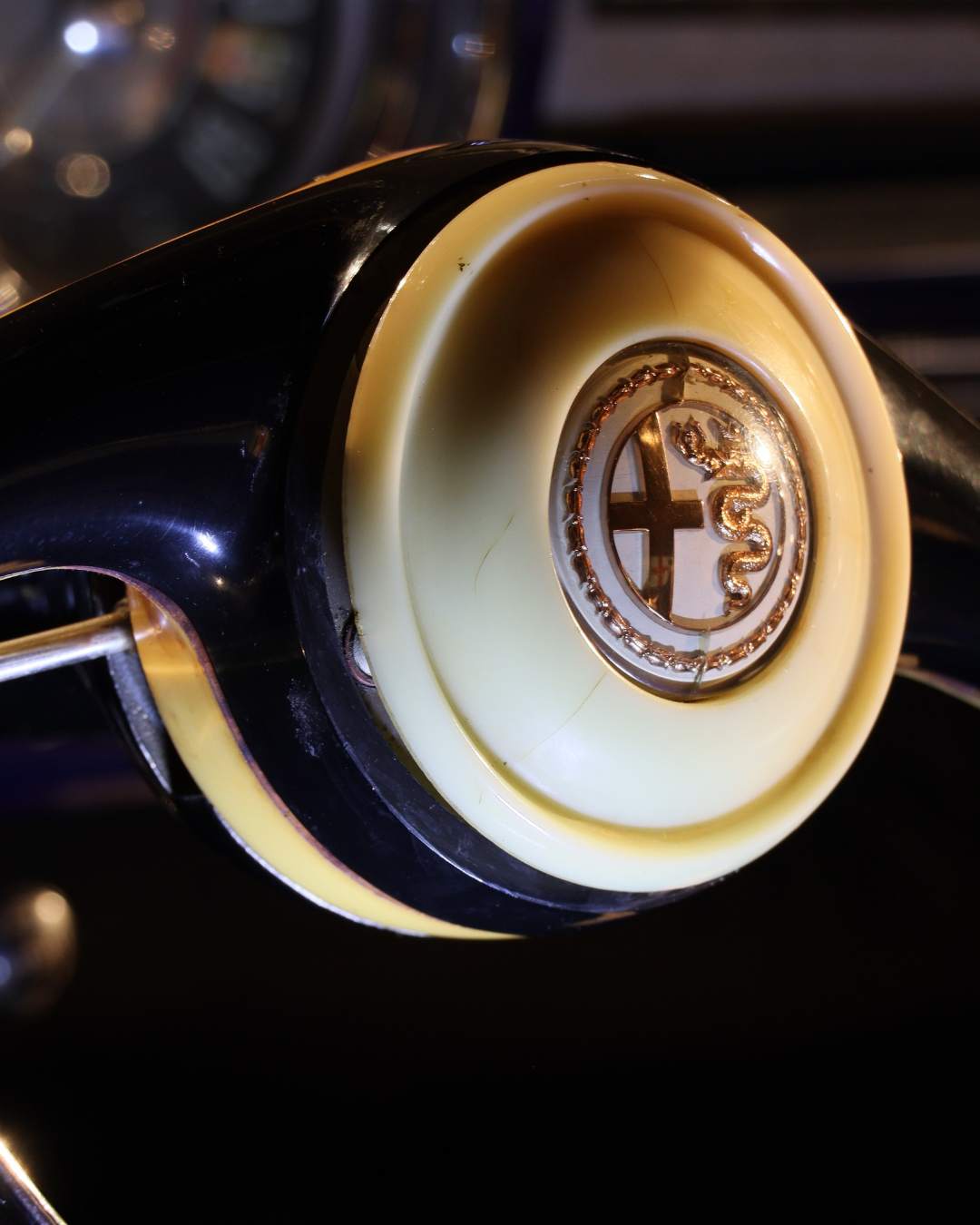 foto 1.6: lo Stemma dell’Alfa Romeo al centro del coperchio copri-mozzo del volante della “Millenove”: croce, biscione e corona d’alloro per celebrare i successi sportivi della Casa Milanese