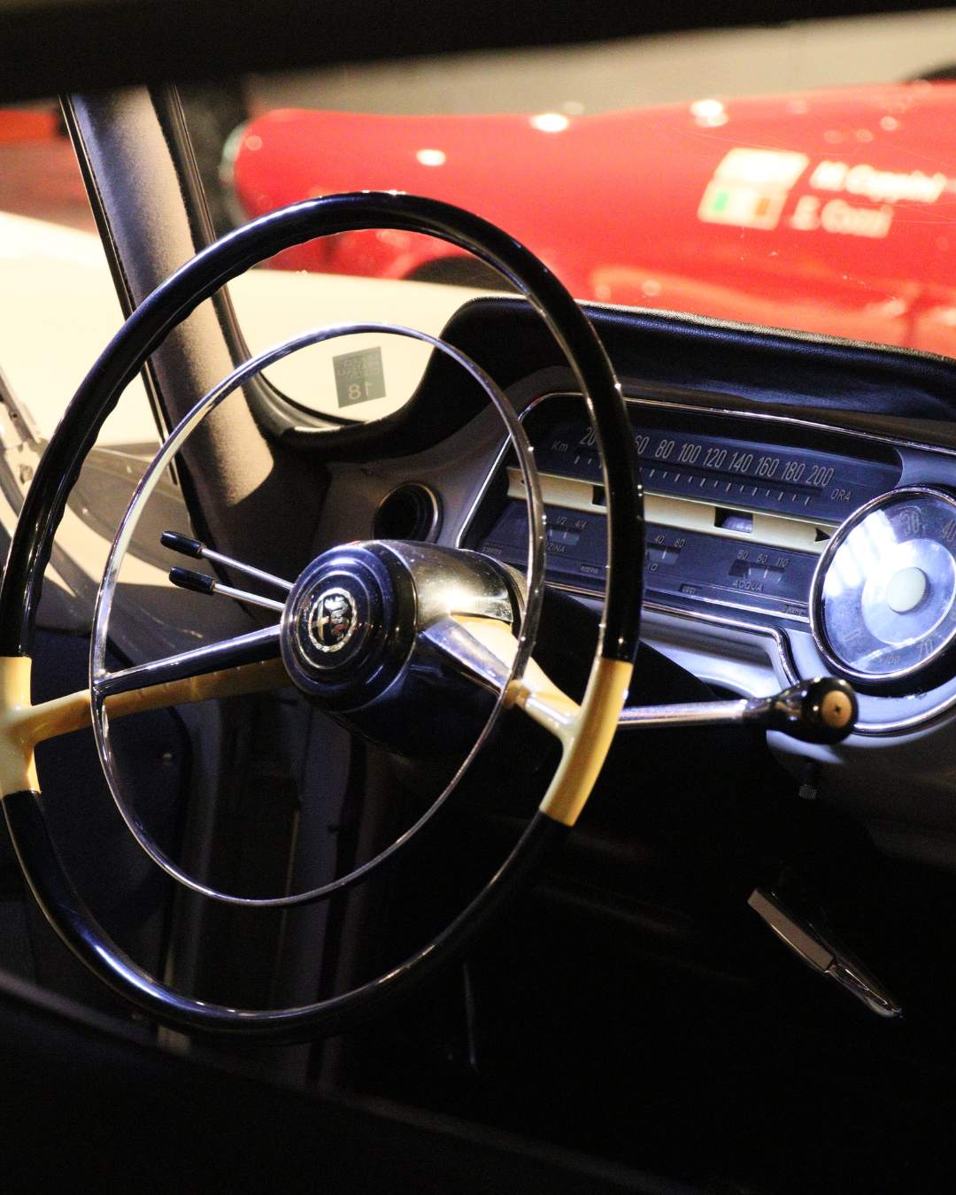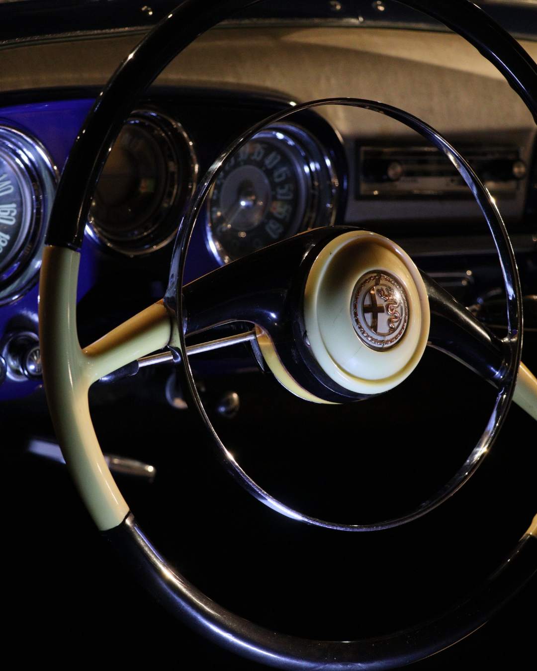 Il volante che equipaggia la 1900 berlina è molto semplice e con un design e una funzionalità definibili come “convenzionali” nei primi anni ’50 (foto 1.3): diametro ampio, bachelite, corona sottile (foto 1.4), bicolore, anello cromato che interseca a metà le due razze (foto 1.5).