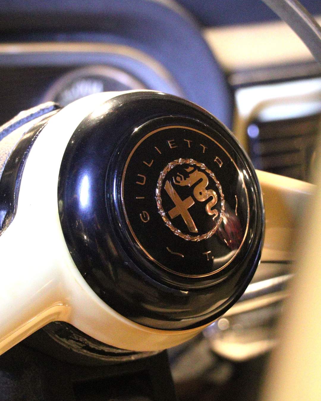 foto 1.8: lo Stemma Alfa Romeo sul coperchio del mozzo del volante della “Giulietta T.I.”: c’è anche la denominazione del modello e della versione specifica