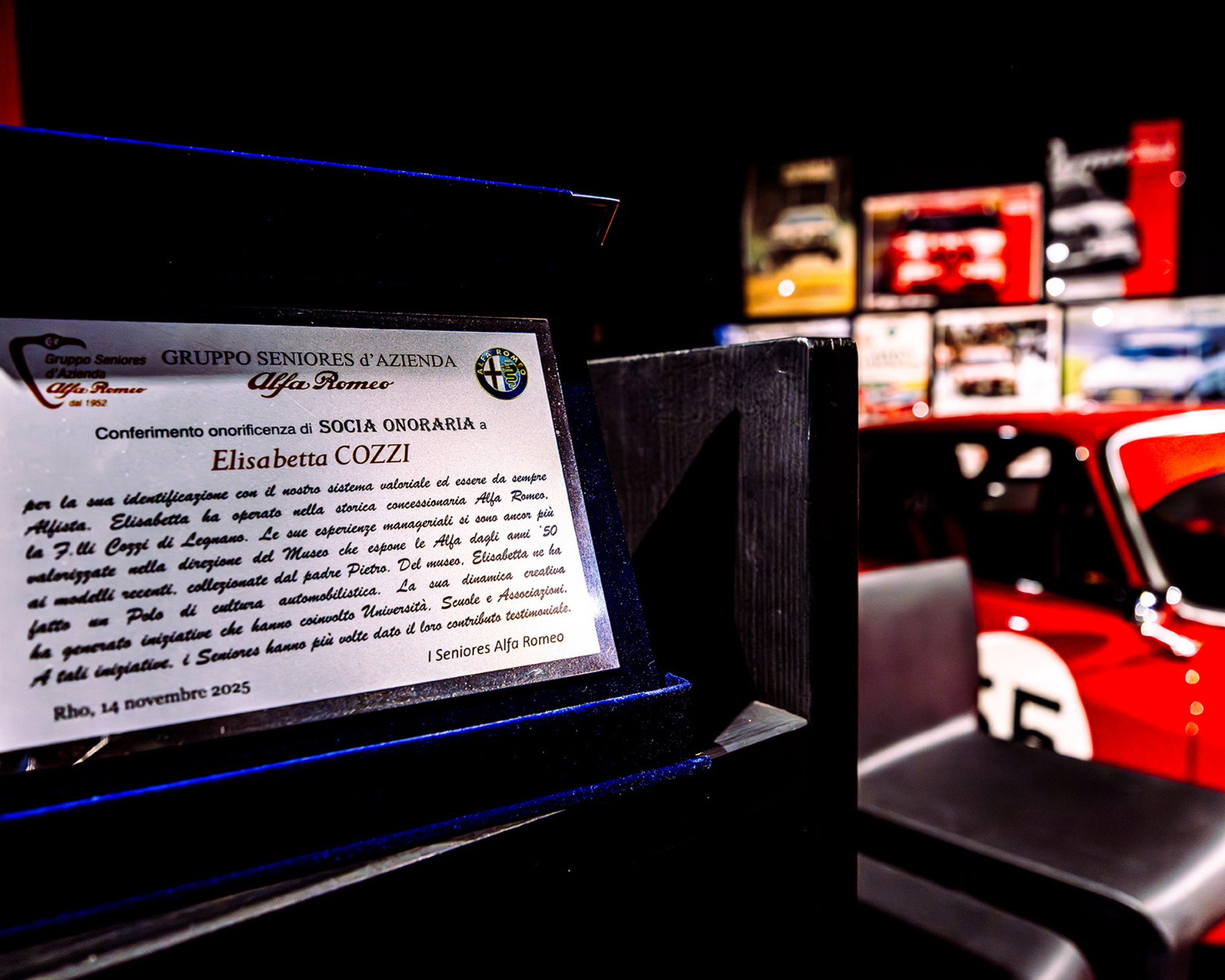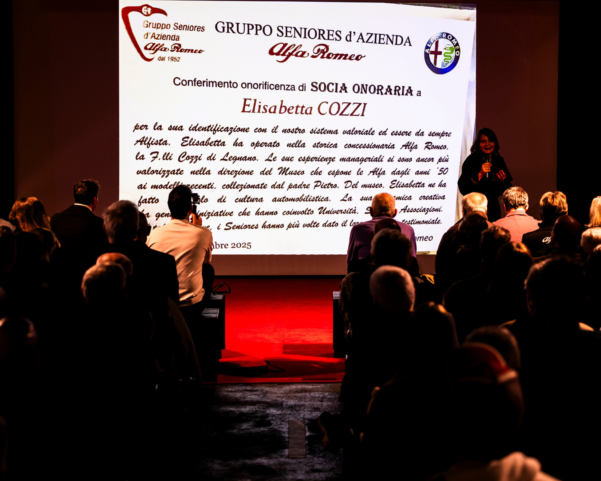 Durante l’evento si è “dato voce” anche alla onorificenza ricevuta da Elisabetta insignita del titolo di Seniores Onoraria da parte del Gruppo Seniores d’Azienda Alfa Romeo. La Consegna ufficiale si è svolta a Rho in occasione del 115° anno di fondazione dell’Alfa Romeo lo scorso 15 novembre e l’evento al museo è stato l’occasione per condividere con il pubblico questo graditissimo riconoscimento. Il Gruppo Seniores degli ex dipendenti, riunito a Villa Burba per celebrare la storia del Biscione, ha conferito gli Attestati di fedeltà a Enrico Lazzati, Luigi Luzzara, Mario Tironi e, alla memoria, Fiorenzo Ventura, la Targa al merito a Bruno Zara e la Targa di “Socio Onorario” a Marino Parolin ed Elisabetta Cozzi, prima donna a ricevere tale riconoscimento.